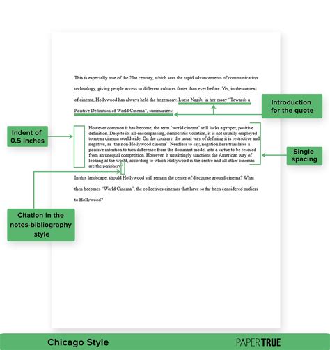 Using our credible Chicago style citation generator will eliminate the scope for such mistakes. A typical quotation is part of a sentence within a paragraph in your paper; however, for longer quotations (more than five lines), format the excerpt as a block quotation.; A block quotation begins on its own line, is not enclosed in quotation marks, and has its in-text citation after the final punctuation. Ask your professor which style they prefer if you are unsure. See Chicago Manual - section 13.9.Sample Paper, Chicago Author-Date Style Sample Paper, and Chicago Style Citation Guide.